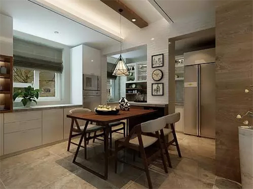 半開放式的廚房與餐廳通過一道窄墻作為分隔,墻體裝飾白色文化磚,增添文藝氛圍,并與窗臺處的置物柜色調呼應。棕褐色實木餐桌配合著米灰軟墊餐椅,空間蘊含著隨性美式的情調。