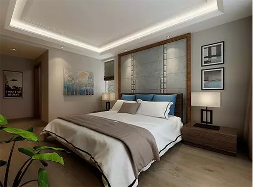 簡約的臥室里,實木床頭柜散發(fā)著木質氳香,配合中式宮燈,在現(xiàn)代壁畫及幾何造型的床頭背景墻營造下,看似樸實無華,實則韻味綿長。天花頂內置燈帶,營造出漂浮的視覺感。