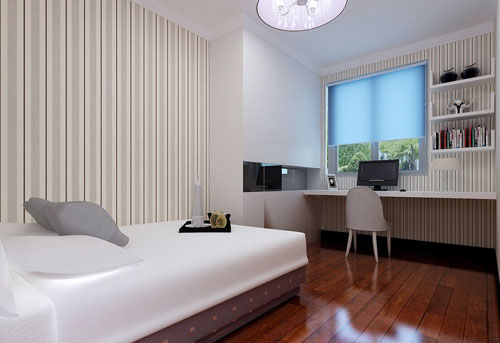 人字拼花的實木復合地板延伸到各個房間,使得整個空間的色彩都圍繞著藍色墻面和拼花地板展開。寬敞的臥室里有著整面墻的衣柜,滿足主人大容量的儲存需求。房間的圓桌設計,還可以供主人在這閱讀小憩,十分愜意!