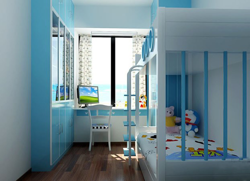 法國藍的淡雅清新很適合用于兒童房的設計,狹長的空間,五臟俱全。床頭的壁燈設計,方便小孩晚上看書。多屜柜和俏皮的飾品,讓室內充滿著童趣。整體清新的色調,彰顯出法式浪漫情調。