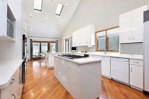 米白色的櫥柜,營造出溫馨的家居氛圍。吊柜的設計和墻面的金屬掛鉤,充分滿足主人的使用需求。人字形的拼花地板延續(xù)了客廳的地面設計,保證了整體裝修風格的統(tǒng)一性。