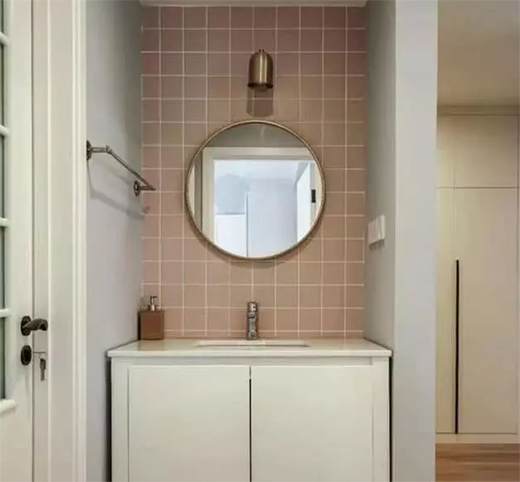 洗漱區(qū)外置在過道上也是近幾年很流行的一種設計,因為這樣的設計既減緩了一體式衛(wèi)生間的使用尷尬問題,同時也可以節(jié)省家人的洗漱時間