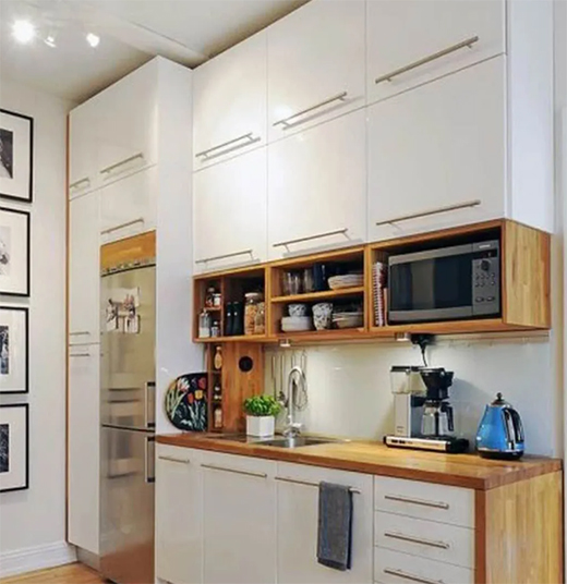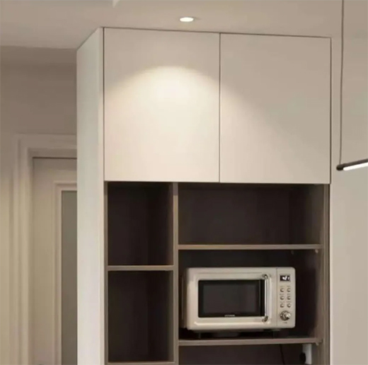 所以,打算裝烤箱、微波爐的話,櫥柜最好設(shè)計成有藏有露,外露的柜體可以放烤箱。