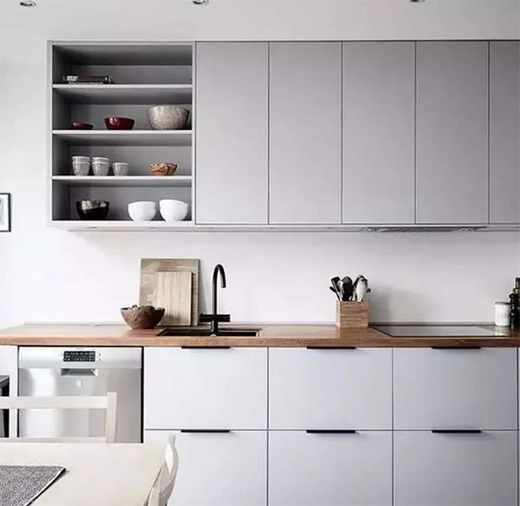 吊柜的留空方式有很多種,可以就在一邊設(shè)計留空,讓整個櫥柜增加一些變化。