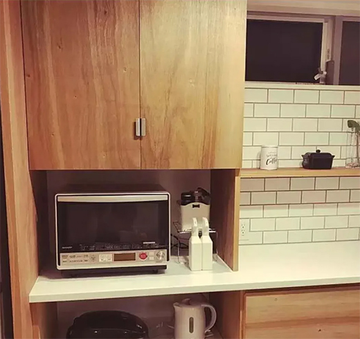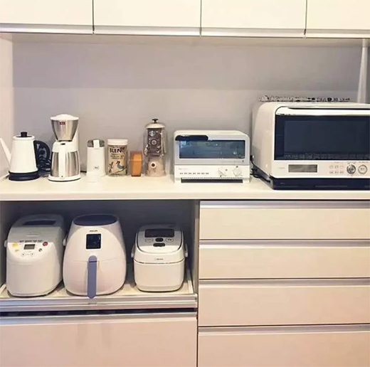 前期設(shè)計的時候需要注意,吊柜的留空一般在柜子底部,而地柜的留空一般都在柜子的頂部,這都是為了方便拿取。地柜留空在日本很常見。電飯煲、電磁爐、熱水壺等這些比較小型的電器都可以放到這里