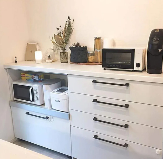 上面說到,可以通過吊柜留空來為電器找到一個容身之所,同樣的,這部分功能也可以搬到地柜上實現(xiàn)。和吊柜一樣,地柜同樣可以留空,方便物品的收納取用。