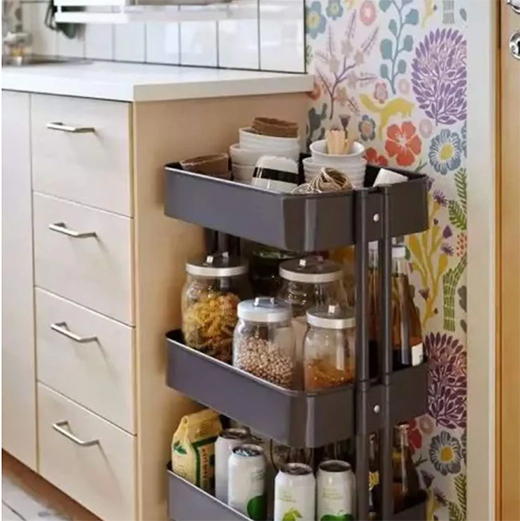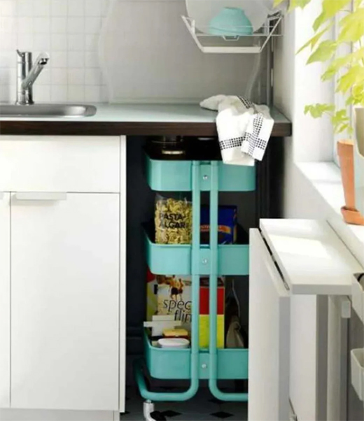 這樣,收納小推車就不會占用過道空間啦,也不用擔(dān)心小推車會讓廚房變得擁擠、凌亂。