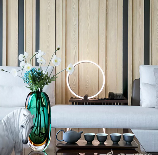 家具的設(shè)計上以深色木質(zhì)元素和白色布藝相互搭配,營造莊重大氣古樸的氛圍;背景墻以原木質(zhì)色的板片進(jìn)行裝飾,豐富了空間的層次感,同時也彰顯了空間主人對自然的追求。