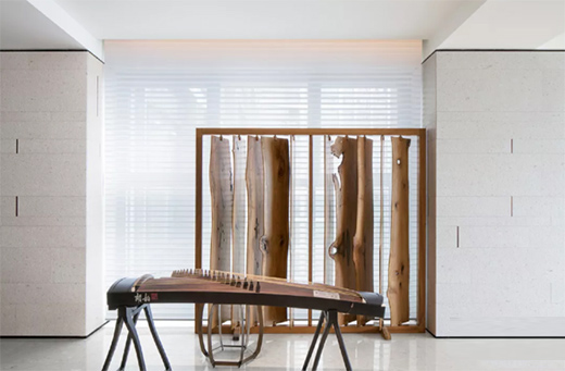 大量留白的處理手法讓人一進(jìn)入餐廳就能夠放松,原木色的餐桌,自然舒適;餐桌旁邊的紅色餐柜,表現(xiàn)出東方的傳統(tǒng)氣息。古箏的設(shè)計以及背景屏風(fēng)裝飾,讓空間的古韻氛圍更加濃厚。