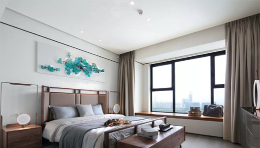 主臥的設(shè)計體現(xiàn)出主人對傳統(tǒng)慢生活習(xí)慣的追求,床鋪家具的設(shè)計上,古樸的色調(diào)帶給人寧靜的氛圍,床尾座上的陶瓷茶杯,滿足了主人愛喝茶的習(xí)慣。