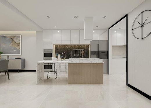 西廚中島臺質感清新的原木和優(yōu)雅奢華的大理石肌理,豐富了平面和立面上的細節(jié)層次,無論何時下廚都給人舒服的溫度。