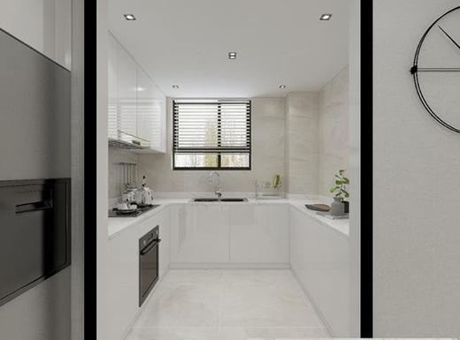 U型設計的廚房,以窗戶外的景色為背景,帶給人舒適自然的居住體驗。備菜區(qū)、洗菜區(qū)、烹飪區(qū)一氣呵成,動線流暢,簡潔大方。