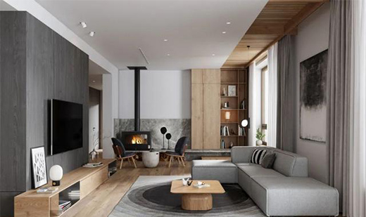 客廳整體以灰白淺棕為主色調(diào),打造了一個低飽和度的舒適空間。