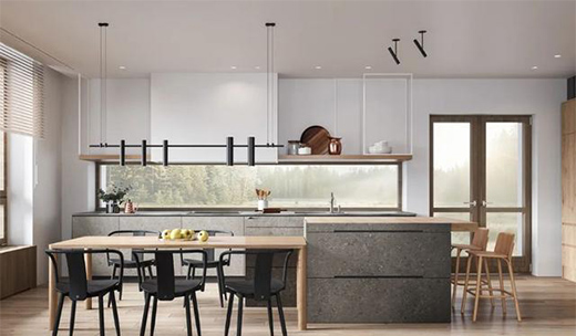 開放式的餐廚區(qū)域采用一體的設(shè)計,白色的集成墻板背景墻上懸掛了定制的櫥柜,鏤空的設(shè)計美觀之余又為儲物帶來便利。水磨石的島臺搭配原木的餐廳以其清麗細(xì)膩的觸感,體現(xiàn)空間的原始匠心風(fēng)尚。低飽和度的色調(diào)和原木設(shè)計把生活平淡質(zhì)樸的一面化形在空間的設(shè)計細(xì)節(jié)里。