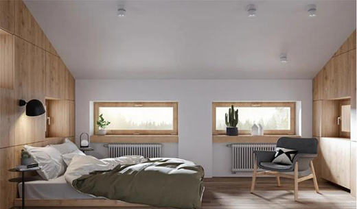 二樓的主臥室也是采用了原始的小木屋設(shè)計,白色的墻壁做主體,搭配兩側(cè)的木質(zhì)花紋集成墻板時尚又不沉悶空間。窗邊的綠植生機勃勃,與墨綠色的床被呼應(yīng)下,彰顯了空間質(zhì)樸素雅的底蘊。