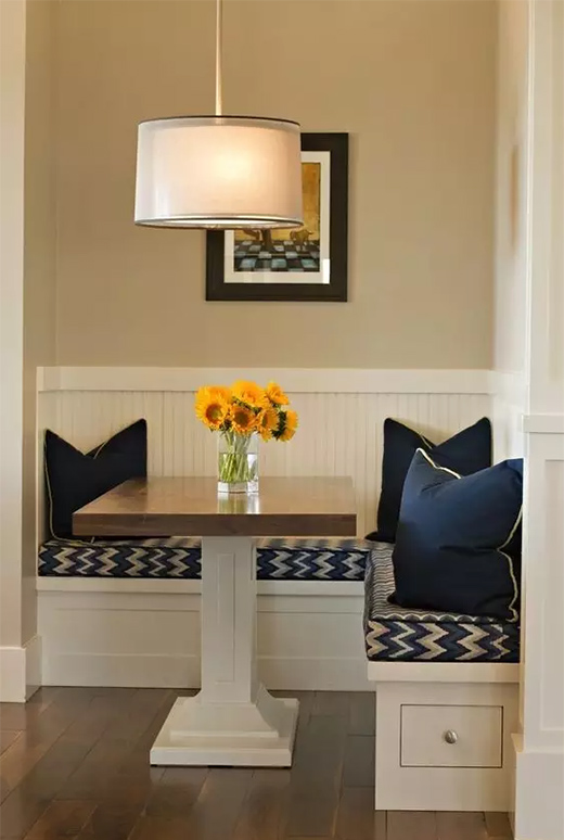 卡座絕對(duì)是小戶型節(jié)約空間的神來之筆,不僅不占地方,還能將卡座下方的空間利用起來,最重要的是可根據(jù)自家的實(shí)際情況定做。
