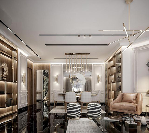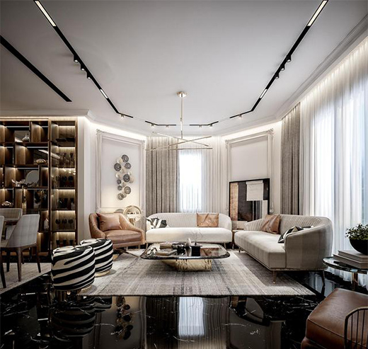 整體色調(diào)打破傳統(tǒng)法式風格,融入皮革、鏡面、絲絨等等一大波時尚元素,讓人眼前一亮!既滿足了現(xiàn)代都市生活方式,又展示了業(yè)主高品質(zhì)的生活品味。