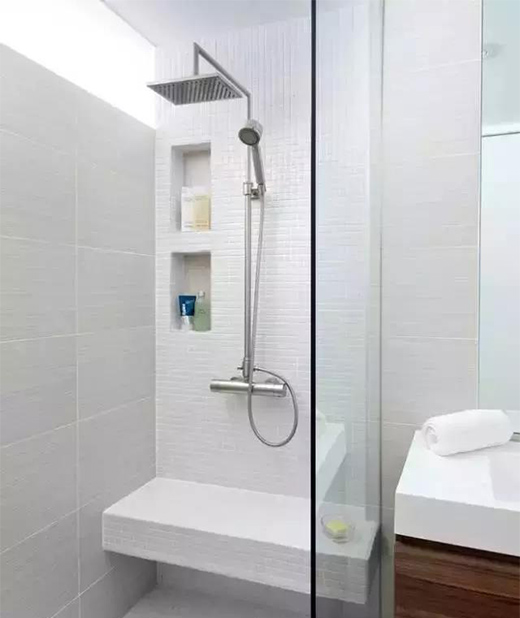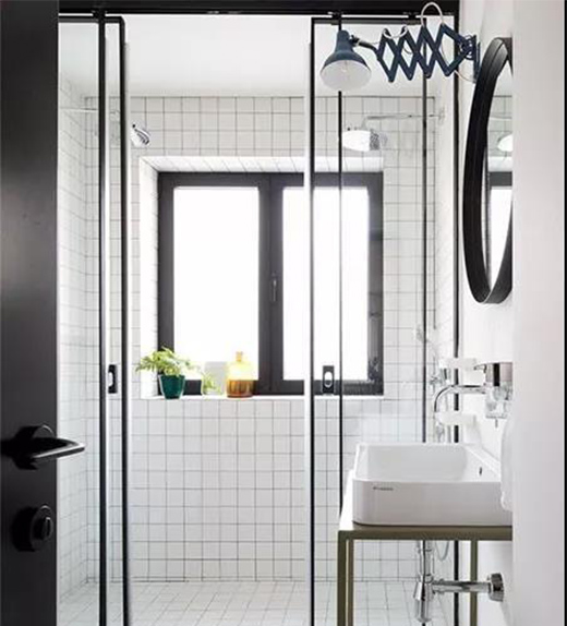 淋浴區(qū)很多人會(huì)設(shè)置擋水條,但是這可能會(huì)增加會(huì)被絆倒的幾率,所以盡量選擇無下軌的移門,下水速度更快的長(zhǎng)條地漏。