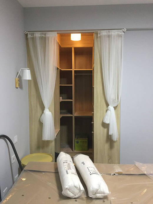 臥室的其中一面墻比較大,那就可以利用起來(lái),把正面墻都做成衣帽間。哪怕用開(kāi)放式的掛鉤或者其他方式,這樣也算是成就了一個(gè)衣帽間!