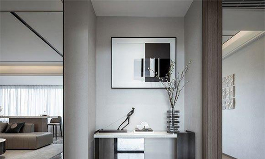 本案是一套面積非常不錯(cuò)的大平層,整體雖然采用現(xiàn)代風(fēng)格來設(shè)計(jì),但設(shè)計(jì)效果卻非常高級(jí)上檔次。先來看看入戶玄關(guān)墻的設(shè)計(jì)效果,造型簡潔的玄關(guān)柜,黑色細(xì)邊框裝飾畫,沒有了華麗的設(shè)計(jì)效果,更多的卻是一種優(yōu)雅格調(diào)與品位。
