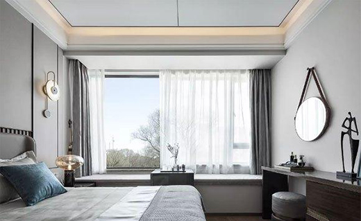 其中一間臥室的裝修效果,和客廳的配色設(shè)計(jì)保持一致,配色素雅但格調(diào)優(yōu)雅。長長的飄窗沒有過多設(shè)計(jì),配上灰色的飄窗墊,再掛上灰色的窗簾,營造出的睡眠環(huán)境特別溫馨。