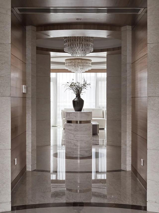 玄關(guān)處使用圓柱和過道的設(shè)計上選用大理石材,對稱中古典優(yōu)雅,彰顯主人的紳士。