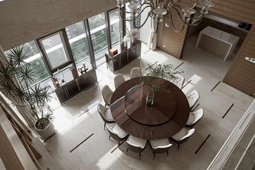 餐廳空間在石材與木材的渲染下,色感溫潤,散發(fā)出奢華的居家氛圍。北美胡桃木的餐桌上擺放插柳綠植、精致的瓷質(zhì)餐具,再加上來自意大利的小牛皮餐椅,都在傳達著獨特港式精致。