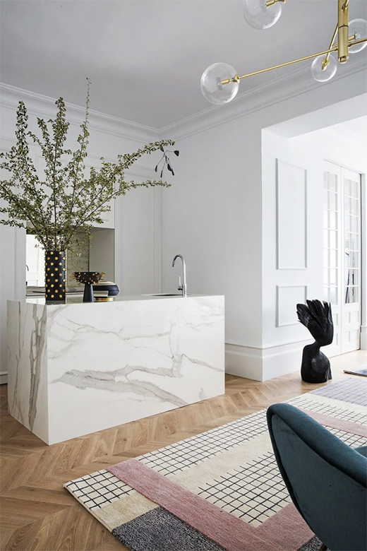 廚房設計比較克制,將所有細節(jié)做到極致:帶有裝飾條的門隱藏著櫥柜和電器,在踢腳板后面有抽屜...