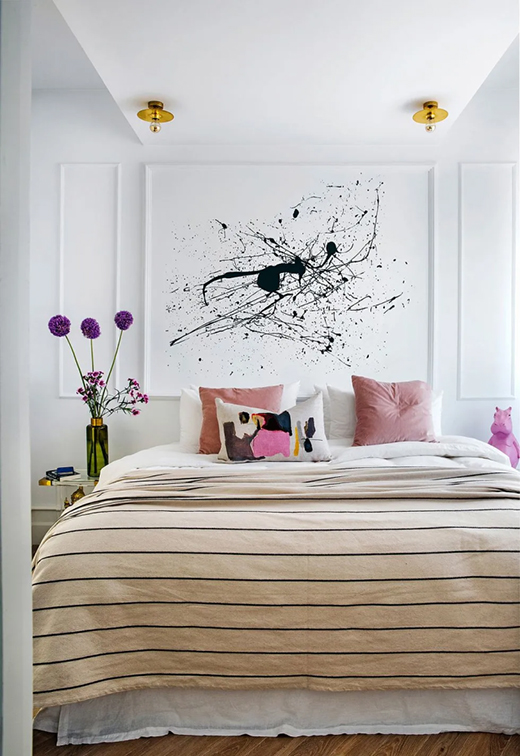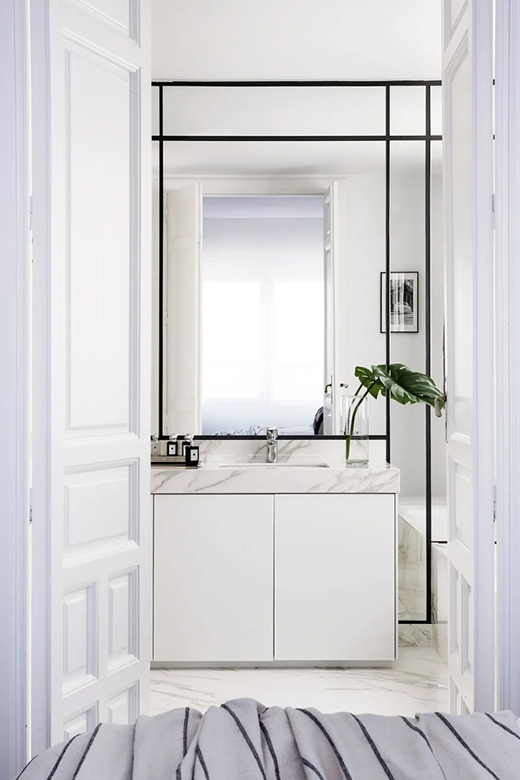 這間寧靜的臥室散發(fā)著光,一組裝飾線條充當床頭板并放置臨時繪畫。浴室里鏡子占據(jù)浴室的整個墻壁,并以其黑色輪廓吸引眼球。