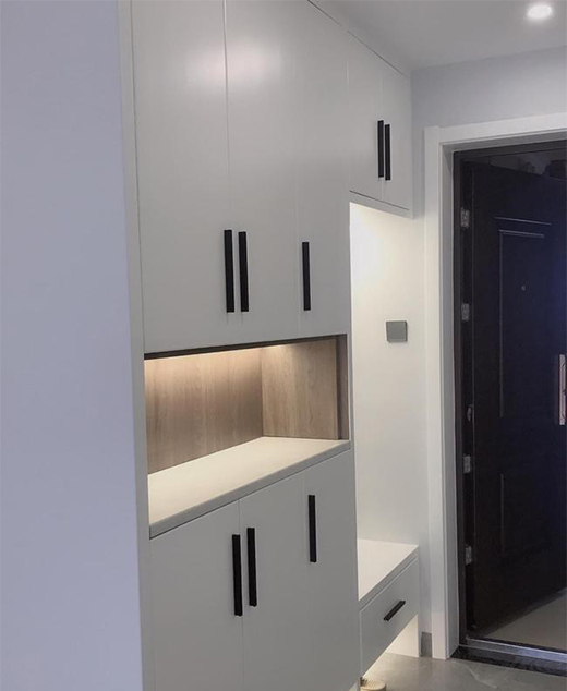 時尚簡約的家裝設(shè)計,灰白黑的搭配風(fēng)格,溫馨舒適還略帶一些輕奢感。玄關(guān)柜整墻設(shè)計,空間利用最大化,平板柜門搭配黑色把手,靠門的位置設(shè)計了換鞋凳和掛衣區(qū),安裝了燈帶,使用起來特別方便。