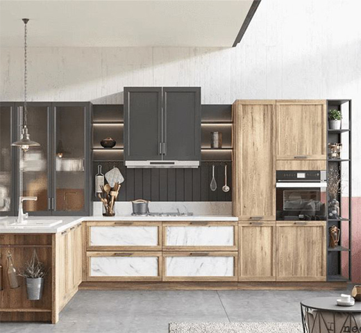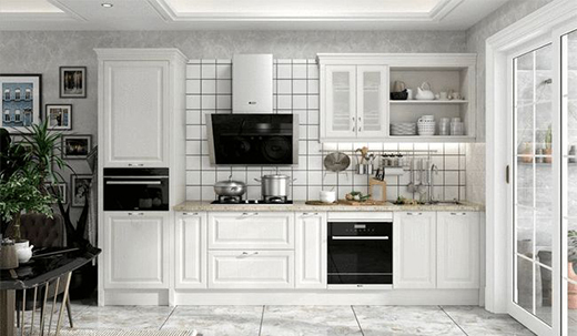 舉個(gè)例子:歐派沙利托風(fēng)格的L型櫥柜,烤箱直接就在櫥柜邊上,不用多占空間。烹飪區(qū)與清洗區(qū)分開(kāi),廚房操作更加便利。