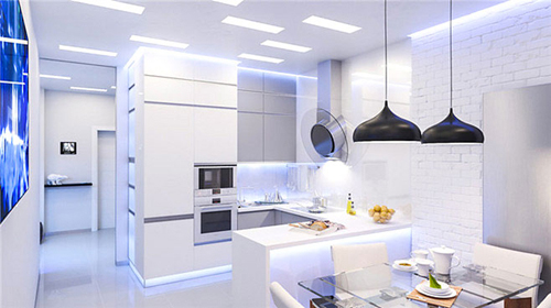 吊柜的設計不額外占用地方,卻能提供更多的收納空間,非常實用。兩扇窗戶滿足采光與通風的需要,白色的墻壁飾以重復的圖案,別致的同時也沒有破壞整體的整齊有序。