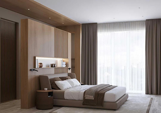 主臥同樣以木色為主,灰色和白色營造出溫暖而私密的氛圍。