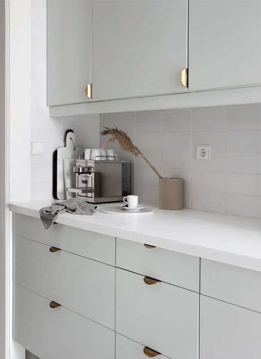 ▲ 進(jìn)門是廚房操作臺(tái),同時(shí)承擔(dān)玄關(guān)柜的功能,淺灰綠色柜門點(diǎn)綴五金拉手,凸顯小輕奢的細(xì)節(jié)