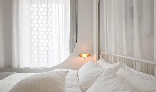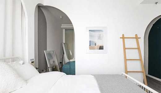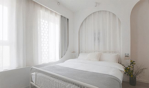 ▲ 臥室延續(xù)整體空間格調(diào),床頭背景做拱形處理,白色紗簾后的掛畫具有朦朧美
