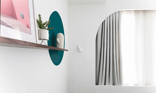 ▲ 利用立面增設(shè)隔板,與圓形色塊穿插,作為書籍和擺件的展示區(qū)