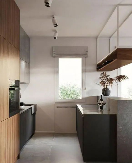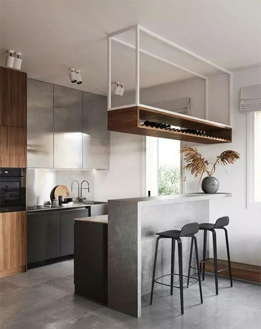 廚房的位置面積很小,定制的不銹鋼櫥柜結(jié)實(shí)耐用。靠吧臺的一側(cè)定制了工作臺,完全能夠滿足日常的餐飲需求。吧臺上方的小酒柜設(shè)計(jì)格外新穎,懸掛式安裝不占地方,更提升了空間的裝修檔次。
