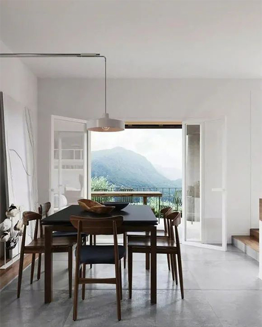 沒有吊頂?shù)牟蛷d空間,一套實(shí)木餐桌餐椅,再掛上一盞造型普通的小吊燈,簡簡單單卻更接地氣??粗T外漂亮的美景,相信用餐時的心情和味口都會好上許多吧。城市里住久了,真的是有些厭煩,每天都面對著高樓大廈,有種讓人透不過氣來的感覺。