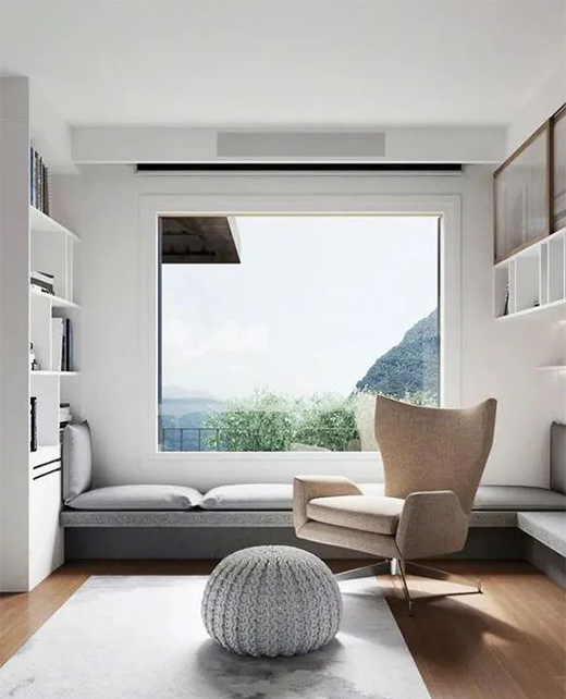 客廳的角落,圍著墻面定制了一排轉(zhuǎn)角式的飄窗來代替沙發(fā),鋪上柔軟舒適的灰色坐墊,讓人有種躺下來的沖動。白色的開放式書柜和吊柜,提升了空間的收納能力。
