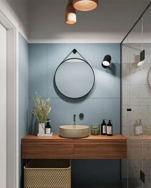 衛(wèi)生間的裝修效果,將浴室柜外移后,對衛(wèi)生間進(jìn)行了簡單的干濕分離處理,掛墻式馬桶讓衛(wèi)生間看起來更加的寬敞。藍(lán)灰色的墻面,防水乳膠漆的使用在國內(nèi)相對少見,但營造出的視覺效果還是蠻不錯的。