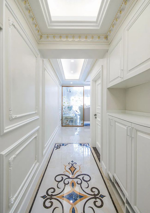 這是入戶玄關,白色為主,金色的點綴起到很好的裝飾效果,讓整個空間看起來更加的豪氣