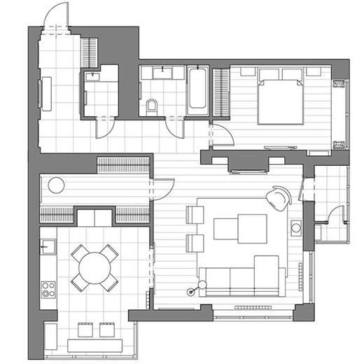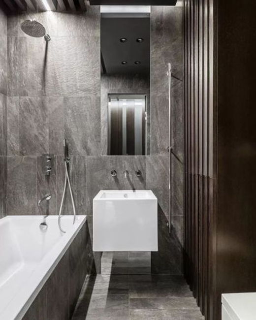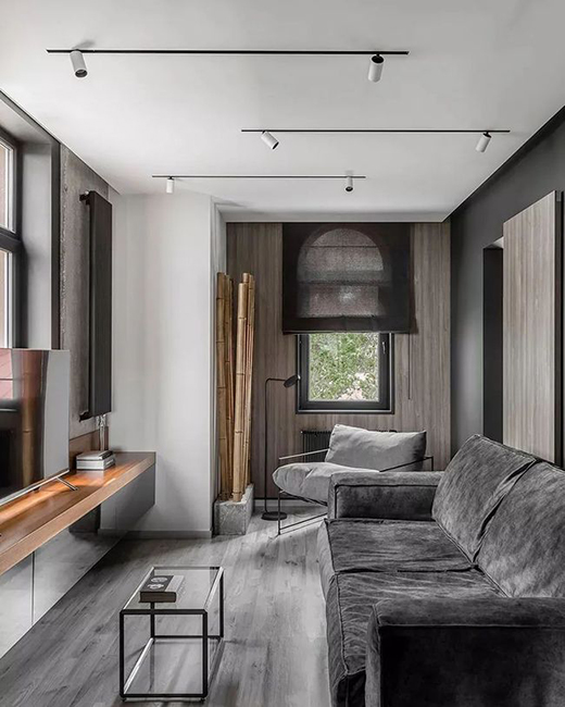 Quadrum工作室設(shè)計的63㎡單身公寓,客戶想要一個現(xiàn)代的內(nèi)飾,陽剛和黑暗。它原本有一條狹長的走廊、孤立的房間、兩個小浴室和一個走廊。在重建過程中,建筑師將廚房與客廳結(jié)合在一起。由于公寓的特定形狀,開放空間被拉長了。以線性方式放置所有功能區(qū)域。