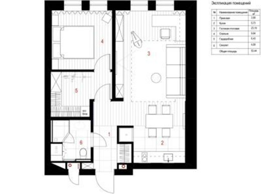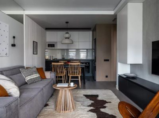 Alexandra Dashkevich和Natalya Kanchukova設(shè)計了一套面積為54㎡的公寓。擁有寬敞的廚房客廳、餐廳和靠窗的工作區(qū)、獨立臥室、帶運動器材存儲空間的大型更衣室、寬敞的外衣衣柜被放置在走廊上。