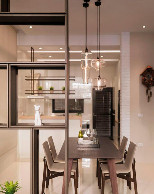 餐廳選擇了簡單的實(shí)木桌椅搭配暖橘色的燈光,打造了一個舒適溫馨的餐廳空間,一家人坐在一起吃飯的時候心情也會好很多。餐廳旁邊就是開放式的廚房,廚房和餐廳之間選擇了一個吧臺作為銜接和過渡,餐廳和客廳之間用鐵藝的懸空置物架作為隔斷,定制的餐廳吊燈也很獨(dú)特。