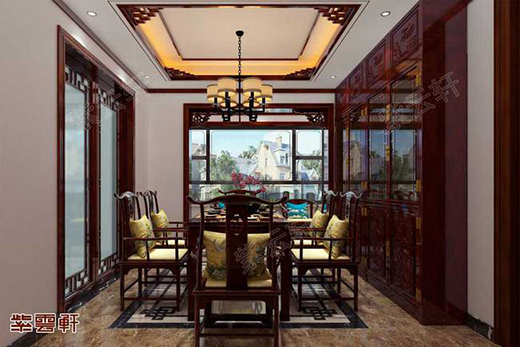 中式餐廳二,窗戶與門框都選用紅木花格邊框進(jìn)行裝飾,墻邊放置一架現(xiàn)場(chǎng)定制的紅木櫥柜,餐桌選用明式官帽桌椅組合,室內(nèi)充滿中式古典格調(diào),嚴(yán)謹(jǐn)?shù)牟季帧⒕碌募揖?,看上去非常驚艷。