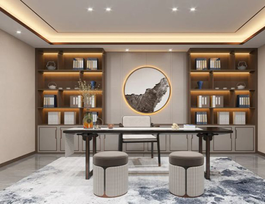 書房在一個(gè)獨(dú)立的空間中,兩側(cè)定制的柜子增加空間的收納,圓形的裝飾畫帶著燈帶的設(shè)計(jì),高級(jí)感與氛圍感都拉滿。