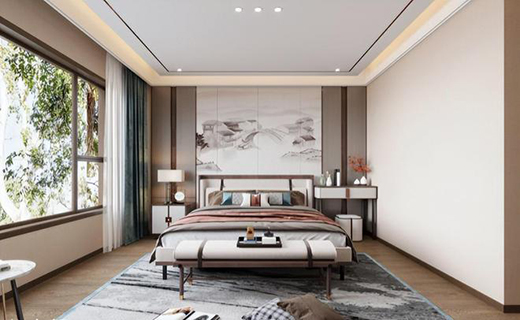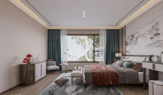 主臥的布置不講求個(gè)性,舒適與放松感是這個(gè)空間所追求的,中式的水墨裝飾的硬包床頭背景墻,搭配著頂部的燈帶設(shè)計(jì),營(yíng)造出一個(gè)精致舒適的休息空間。