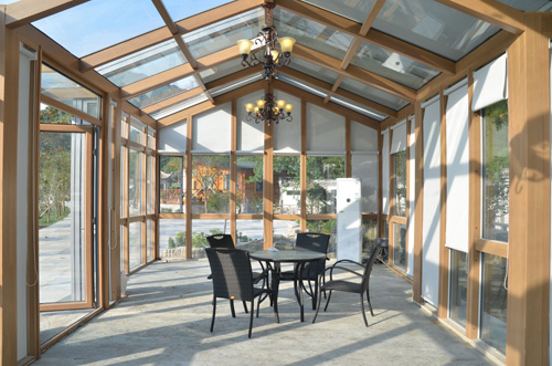 這種類型的別墅陽光房一般是包木或純木結構架,外加夾膠中空鋼化玻璃,實木或鋁包木門窗(門窗裝修效果圖)。如果選用塑鋼窗在密封效果上會比其他門窗更好些。這種類型的別墅陽光房可加上專用通風裝置及遮陽系統(tǒng),使其功用性更好,后期使用起來會更便捷更實用。