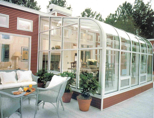 別墅陽光房可以依照主題建筑風格選用不同的樣式,并可根據個人喜好選用各種顏色和形狀。如:選用陽光板做為屋頂主材的屋頂可做成弧形、八角型、屋脊型、一面坡型等,而要以玻璃作為主材的,屋頂則多為屋脊型、八角型和一面坡型的。