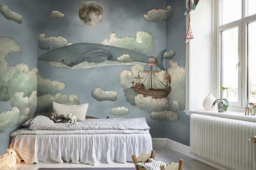 皎潔無暇的月光下,一條巨大的鯨魚遨游在蔚藍色的天空中,姿態(tài)萬千的云朵飄浮在空中,輕盈地拖起遠航的帆船,駛向夢想的彼岸。身處如此輕柔溫暖的兒童房里,每天都枕著軟綿綿的云朵睡覺,想必小寶貝一定有個最香甜的夢。